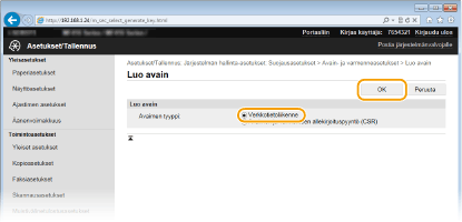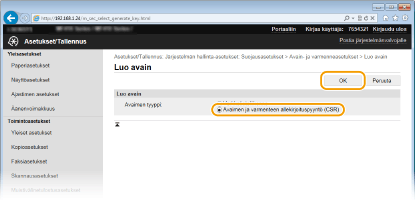 Valitse [Avaimen ja varmenteen allekirjoituspyyntö (CSR)] ja sitten [OK].