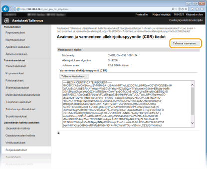 Varmenteen allekirjoituspyynnöllä (CSR) luotua avainparia ei voi käyttää, ennen kuin varmenne on tallennettu. Kun varmenteen myöntäjä on myöntänyt digitaalisen varmenteen, tallenna se alla kuvatuin toimenpitein.