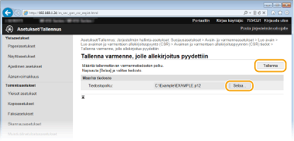 Napsauta [Selaa], määritä varmenteen allekirjoituspyynnön tiedosto ja napsauta [Tallenna].