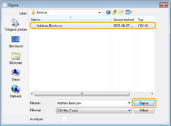 Faxdrivrutinen kan läsa in följande tre filformat: CSV-filer (*.csv), Canon Address Book-filer (*.abk) samt enhetskonfigurationsfiler (*.dcm).