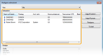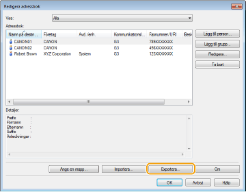 Adressboksdata i CSV-format som har skapats i program som Microsoft Excel kan importeras till enheten. Adressboksdata kan också exporteras till en fil som kan användas på andra faxenheter eller i andra program.