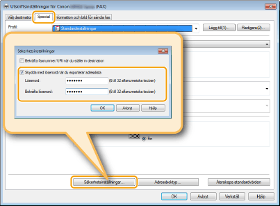 Om du har valt [Skydda med lösenord när du exporterar adresslista] i dialogrutan som visas när du klickar på [Säkerhetsinställningar] på fliken [Special] visas en dialogruta där du ska ange lösenord när du klickar på [Exportera]. Mer information får du om du klickar på [Hjälp] på faxdrivrutinsskärmen.