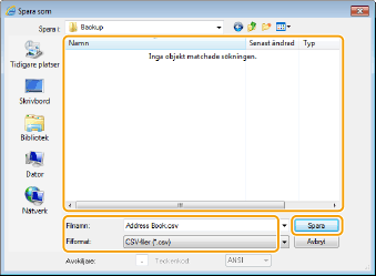 Faxdrivrutinen har stöd för att skriva ut följande två filformat: CSV-filer (*.csv) och Canon Address Book-filer (*.abk).