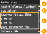 , otevře se obrazovka, kde můžete zkontrolovat průběh tisku, odesílání nebo přijímání dokumentů a také stav zařízení (např. zbývající množství toneru v kazetách) a nastavení sítě, například IP adresu zařízení.