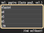 Výše uvedená obrazovka nastavení se po vložení papíru nezobrazíPokud do víceúčelové přihrádky vkládáte stále stejný papír, můžete nastavení papíru přeskočit tím, že nastavíte tuto velikost a typ papíru jako výchozí. Pokud je však nastavena výchozí velikost a typ papíru, obrazovka nastavení se nezobrazuje. Chcete-li, aby se obrazovka zobrazovala, vyberte pro položku <Určit při vkládání papíru> (Registrace výchozího nastavení papíru pro víceúčelovou přihrádku).