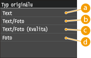 Můžete určit optickou obrazovou kvalitu kopie podle typu dokumentu, například dokumenty obsahující pouze text, dokumenty s nákresy nebo grafy, nebo fotografie z časopisu.