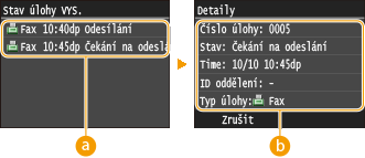 <Detaily>Umožňuje zobrazení podrobných informací týkajících se dokumentů vybraných ze seznamu. Pokud je zadán větší počet míst určení, zobrazí se na obrazovce jejich počet. Chcete-li zkontrolovat podrobnosti o více zadaných místech určení, klepněte na tlačítko <Místo určení>.