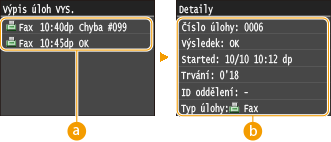 ![]() <Výpis úloh VYS.>/<Výpis úloh PŘ.>Umožňuje zobrazit seznam odeslaných a přijatých dokumentů. <OK> je zobrazeno, pokud byl dokument úspěšně odeslán nebo přijat, a <Chyba> je u dokumentu zobrazeno, pokud se odeslání nebo příjem nezdařily z důvodu jejich zrušení nebo výskytu chyby.