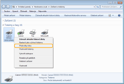 Klikněte pravým tlačítkem na ikonu faxového ovladače pro dané zařízení a klikněte na možnost [Předvolby tisku].