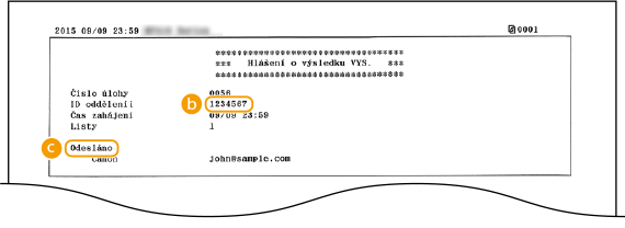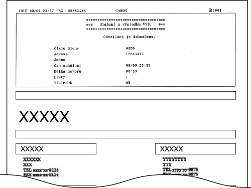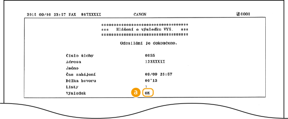 Můžete zkontrolovat výpisy faxů a e-mailů/i-faxů týkající se odeslaných dokumentů a také výpisy naskenovaných dokumentů uložených do sdílené složky nebo na server FTP a hlášení o výsledku VYS. Hlášení lze vytisknout vždy po dokončení přenosu nebo ve chvíli, kdy dojde k chybě.
