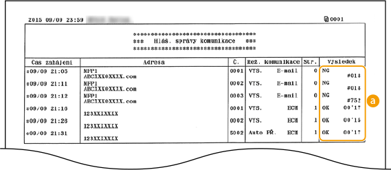V hlášení správy komunikace můžete zkontrolovat výpisy faxů a e-mailů týkající se odeslaných a přijatých dokumentů. Hlášení lze nechat tisknout automaticky vždy po uskutečnění 40 přenosů nebo je můžete vytisknout ručně.