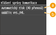 Vyberete-li možnost <Zapnuto>, vytiskne se hlášení automaticky vždy po uskutečnění 40 přenosů. Pokud nechcete tisknout hlášení automaticky, vyberte možnost <Vypnuto>.