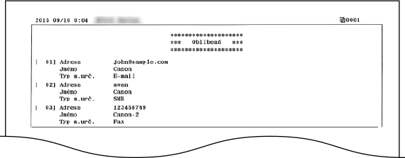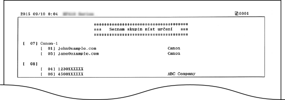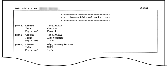 Pokud vytisknete seznam adresáře, můžete zkontrolovat seznamy míst určení <Kódovaná volba>, <Oblíbená> a <Skup. vytáčení> uložené v adresáři.