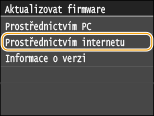 Pokud jde o firmware, vyberte způsob aktualizace podle podmínek instalace zařízení. Existují dva způsoby aktualizace firmwaru: jednou je přístup k nejnovější verzi firmwaru na internetu ze zařízení a provést aktualizaci, pokud verze momentálně nainstalovaná v zařízení není nejnovější, a druhou je přístup k nejnovější verzi firmwaru na internetu z počítače a provedení aktualizace z počítače, pokud verze momentálně nainstalovaná v zařízení není nejnovější. V prostředí, kde nelze vytvořit připojení k internetu pomocí bezdrátové sítě LAN, zajistěte připojení pomocí kabelové sítě LAN nebo USB a proveďte aktualizaci z počítače.