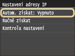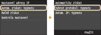 ![]() Je-li zobrazena zpráva <Zapnuto>, klepněte na tlačítko <Automaticky získat>, a možnosti <Vybrat protokol> i <Automatická adresa IP> nastavte na hodnotu <Vypnuto>.