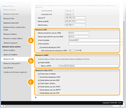 mDNS (multicast DNS) je protokol přijatý službou Bonjour, který slouží k přiřazení názvu hostitele k IP adrese bez použití systému DNS. Chcete-li funkci mDNS povolit, zaškrtněte políčko a zadejte název mDNS do textového pole [Název mDNS]. [Nastavení volby DHCP][Získat jméno hostitele]