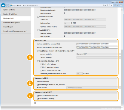 Políčko zaškrtněte, pokud chcete dynamicky aktualizovat záznamy služby DNS po každé změně IP adresy zařízení. Pro zadání typů adres, které chcete zaregistrovat na serveru DNS, zaškrtněte políčko [Uložit ruční adresu], [Uložit stavovou adresu] nebo [Uložit bezstavovou adresu]. Interval mezi aktualizacemi lze zadat v hodinách do textového pole [Interval dynamické aktualizace DNS]. [Nastavení mDNS][Použít mDNS]