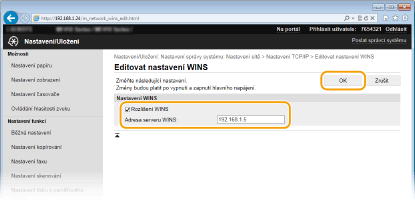 Pokud se IP adresa serveru WINS získává ze serveru DHCP, přepíše získaná IP adresa IP adresu zadanou v textovém poli [Adresa serveru WINS].