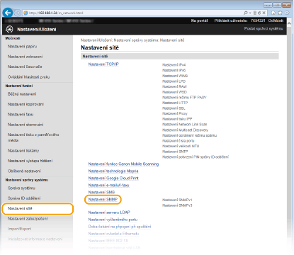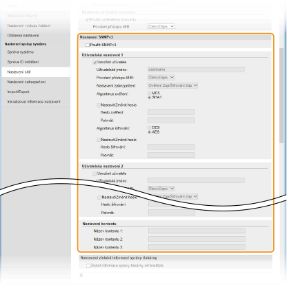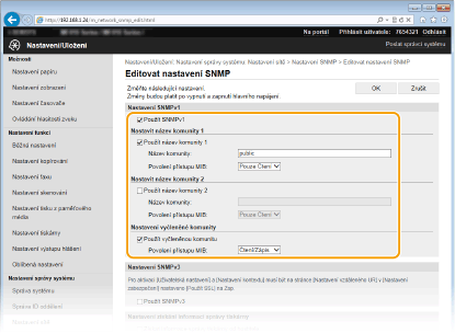 SNMP (Simple Network Management Protocol) je protokol určený k monitorování a ovládání komunikačních zařízení v síti pomocí funkce MIB (Management Information Base). Zařízení podporuje protokol SNMPv1 a protokol SNMPv3 s vylepšenými funkcemi zabezpečení. Stav zařízení lze zkontrolovat z počítače při tisku dokumentů nebo pomocí Vzdáleného uživatelského rozhraní. Můžete povolit buď protokol SNMPv1, nebo SNMPv3, případně oba současně. U každé verze zadejte nastavení odpovídající síťovému prostředí a účelům používání.