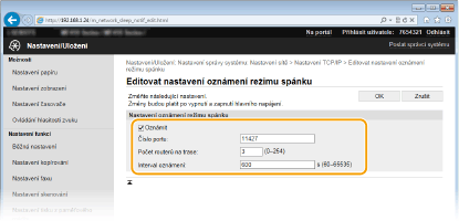 Políčko zaškrtněte, pokud chcete software pro správu zařízení upozorňovat na stav napájení zařízení. Je-li zaškrtnuto políčko [Oznámit], nebude docházet ke zbytečné komunikaci zařízení během režimu spánku a sníží se celková spotřeba energie. [Číslo portu]