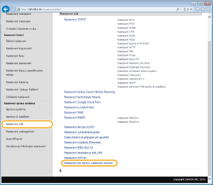 Použití doplňků aplikace iW Management ConsoleMusíte povolit nastavení vyhrazeného portu a protokolu SNMP. Při nastavování SNMP nastavte [Povolení přístupu MIB] na [Čtení/Zápis] pro oba doplňky SNMPv1 a SNMPv3.