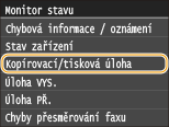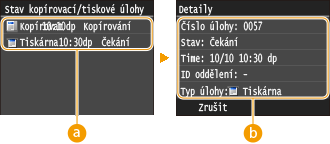 ![]() <Stav kopírovací/tiskové úlohy>Zobrazí seznam dokumentů, které se zpracovávají, kopírují nebo čekají na zpracování.