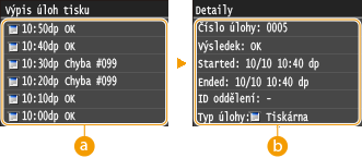 ![]() <Výpis úloh tisku>Zobrazí seznam vytištěných dokumentů. <Pokud byl dokument vytištěn úspěšně, zobrazí se zpráva <OK>, pokud se dokument nepodařilo vytisknout, protože byl zrušen nebo došlo k chybě, zobrazí se zpráva <Chyba>.