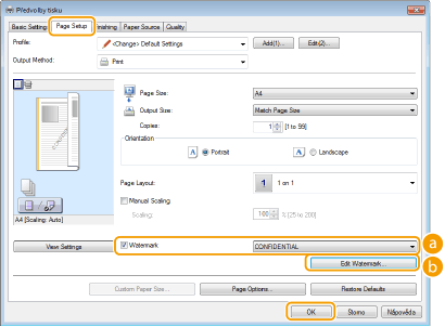 Zaškrtnutím pole [Watermark] (Vodoznak) zobrazte seznam vodoznaků v rozbalovacím seznamu. Vyberte vodoznak z nabídky.