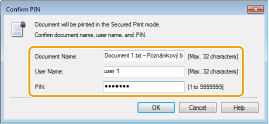 Zadejte [Document Name] (Název dokumentu), [User Name] (Uživatelské jméno) a [PIN] a klikněte na tlačítko [OK].