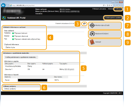 Zobrazí aktuální stav zařízení a chybové zprávy. Pokud došlo k výskytu chyby, zobrazí se také odkaz na stránku s informacemi o chybě.