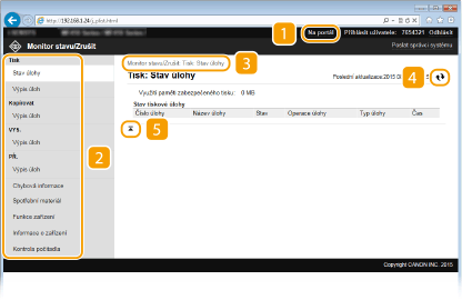 Zobrazí stav právě tištěných dokumentů a historii vytištěných, kopírovaných, odeslaných a přijatých dokumentů. Můžete také ověřit stav zařízení.