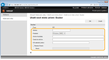 Pomocí počítače můžete uložit nebo upravit místo určení v adresáři zařízení. Zde zadejte sdílenou složku nebo adresu serveru FTP.