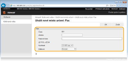 Nastavení [VYS. s ECM] a [Rychlost] můžete rovněž zadat v části <Nastavení faxu> ( Nastavení faxu (MF515x)) na ovládacím panelu. Nastavení provedená v části <Adresář> jsou však povolená pro podrobná nastavení míst určení, která jsou uložená v adresáři.
