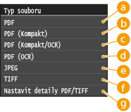 Můžete vybrat formát souborů, do kterého se mají dokumenty naskenovat. Vybrat lze formát PDF, JPEG nebo TIFF. U formátu PDF můžete vybrat vysoce komprimovaný soubor PDF s omezenou velikostí souboru nebo soubor PDF s vyhledáváním textu připravený pomocí optického rozpoznávání znaků (OCR).
