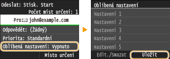Chcete-li upravit nebo odstranit uložené nastavení, přejděte na možnost <Skenovat>  <E-mail>/<I-fax>/<Soubor>  <Oblíbená nastavení>  <Edit./Smazat>  <Editovat> nebo <Smazat> a poté postupujte podle níže uvedených kroků.