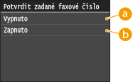 Zařízení lze nastavit tak, aby při zadání faxového čísla pomocí číselných tlačítek vyzvalo uživatele k opakovanému zadání pro potvrzení. Tímto způsobem můžete snížit riziko odeslání faxů na nesprávná čísla kvůli chybnému zadání.