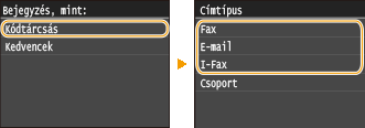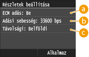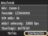 <Faxbeállítások> menüpontban is megadhatja. A <Címjegyzék> adataiból végzett beállítások azonban a Címjegyzékbe bejegyzett rendeltetési helyek részletes beállításaihoz vannak engedélyezve. |
