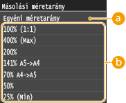 A másolatokat előre beállított méretarányok szerint (pl. <A5->A4>), illetve 1%-os lépésenként beállítható egyéni másolási méretarány megadásával nagyíthatja, illetve kicsinyítheti.