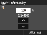 gombok vagy a számgombok megérintésével adja meg a másolási méretarányt, és érintse meg az <Alkalmaz> gombot. A készüléken 25% és 400% közötti másolási méretarányok adhatók meg 1%-os lépésekkel.