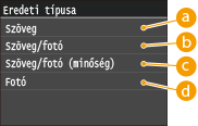 Kiválaszthatja a másolás optikai képminőségét a dokumentum típusa – például csak szöveges dokumentum, diagramokat és ábrákat tartalmazó dokumentum vagy újságfényképek – szerint.