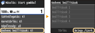 Legfeljebb négy gyakran használt másolásbeállítás-kombinációt tárolhat. Szükség esetén elegendő kiválasztania egy tárolt kombinációt, így nem lesz szükség ugyanazoknak a beállításoknak a konfigurálására minden másolás alkalmával; így például ha Ön a példányszámot gyakran 5-re állítja be, állítsa a <Kerettörlés> funkciót <Be> értékre, és másoláskor növelje az élességet. A beállításokat gyorsgombokként is megjelenítheti a Főképernyő felületén.