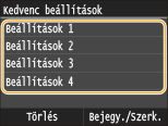 Ha törölni kíván egy bejegyzett beállítást, érintse meg: <Másolás>  <Kedvenc beállítások>  <Törlés>  Válassza ki a beállításokat  <Igen>  <Igen>.