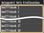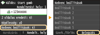 Legfeljebb 18 gyakran használt faxbeállítás-kombinációt tárolhat. Szükség esetén gyorsan megjelenítheti a bejegyzett beállításokat, elkerülve annak szükségességét, hogy minden alkalommal bonyolult beállításokat kelljen megadnia, például „egy kétoldalas eredeti dokumentum beolvasása, elküldése 5 címzettnek, és az élesség beálltása”. A beállításokat gyorsgombokként is megjelenítheti a Főképernyő képernyőn.