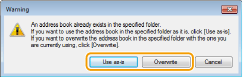 Ha az 5. lépésben megadott mentési helyen már léteznek címjegyzékadatok, akkor a következő üzenet jelenik meg. Ha a meglevő címjegyzéket szeretné használni, kattintson a [Használat változatlan formában], pontra; ha felül szeretné írni azt a jelenlegi címjegyzékkel, kattintson a [Felülírás].