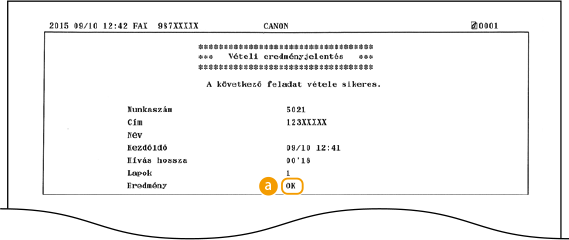 A fogadott faxok vagy i-faxok naplóit a fogadott eredmények jelentésének kinyomtatásával ellenőrizheti. A jelentés kinyomtatható minden adatátvitelt követően, vagy csak akkor, ha fogadási hiba történik.
