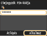 Ha a címjegyzékhez PIN-kód van beállítva, exportálás közben megjelenik a <Címjegyzék PIN-kódja> képernyő. Adja meg a címjegyzék PIN-kódját, és érintse meg az <Alkalmaz> gombot. A címjegyzékadatok exportálásának megszakításához érintse meg a <Átlépés> gombot.