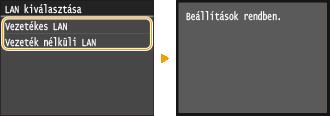 Miután eldöntötte, hogy vezetékes vagy vezeték nélküli hálózaton keresztül csatlakoztatja-e a készüléket a számítógéphez, válassza ki a vezetékes vagy vezeték nélküli helyi hálózatot a kezelőpanelen. Fontos, hogy ha a <Vezetékes LAN> beállítást <Vezeték nélküli LAN> értékre állítja vagy fordítva, akkor el kell távolítania a számítógépre telepített MF-illesztőprogramokat, majd újra kell azokat telepítenie. A részleteket lásd: „MF Driver Installation Guide (MF-illesztőprogram-telepítési útmutató)”.