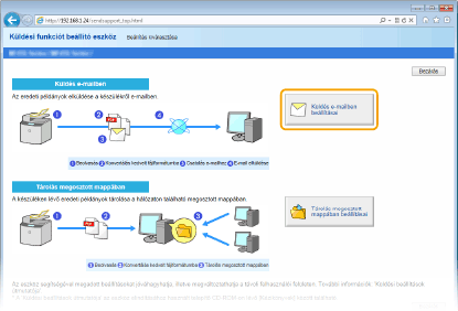 A Küldés-Funkció Beállító Eszköz segítségével konfigurálhatja az e-mail küldés alapvető beállításait. A részletesebb beállításokat (például a küldés előtti POP-hitelesítés vagy a titkosított kommunikáció beállításait) a Küldés-Funkció Beállító Eszköz helyett a Távoli felhasználói felületről konfigurálhatja. E-mail és i-fax kommunikációs beállítások konfigurálása