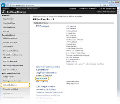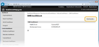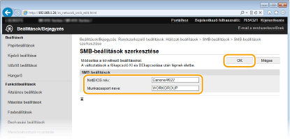 Az SMB (Server Message Block) egy protokoll, amellyel erőforrások, például fájlok és nyomtatók oszthatók meg egy hálózaton több más eszköz között. A készülék az SMB protokollal tárolja a beolvasott dokumentumokat a megosztott mappákban. A hálózattól függően előfordulhat, hogy be kell állítania a NetBIOS nevet és munkacsoportnevet.