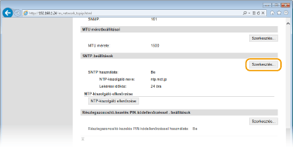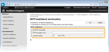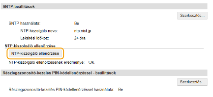 Az NTP/SNTP-kiszolgálóval folytatott kommunikáció teszteléseA bejegyzett kiszolgálóval folytatott kommunikáció állapotának megtekintéséhez kattintson a [Beállítások/Bejegyzés]